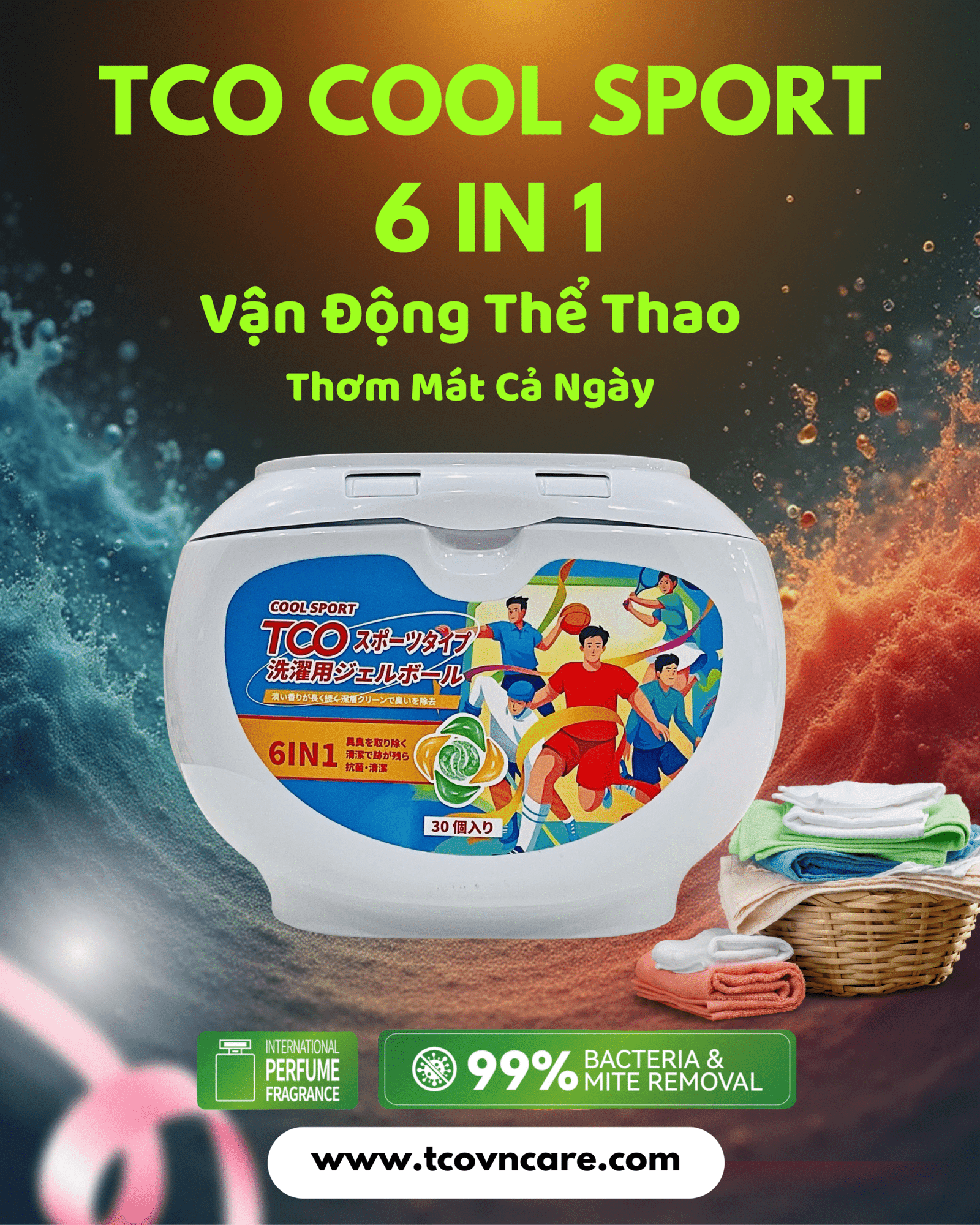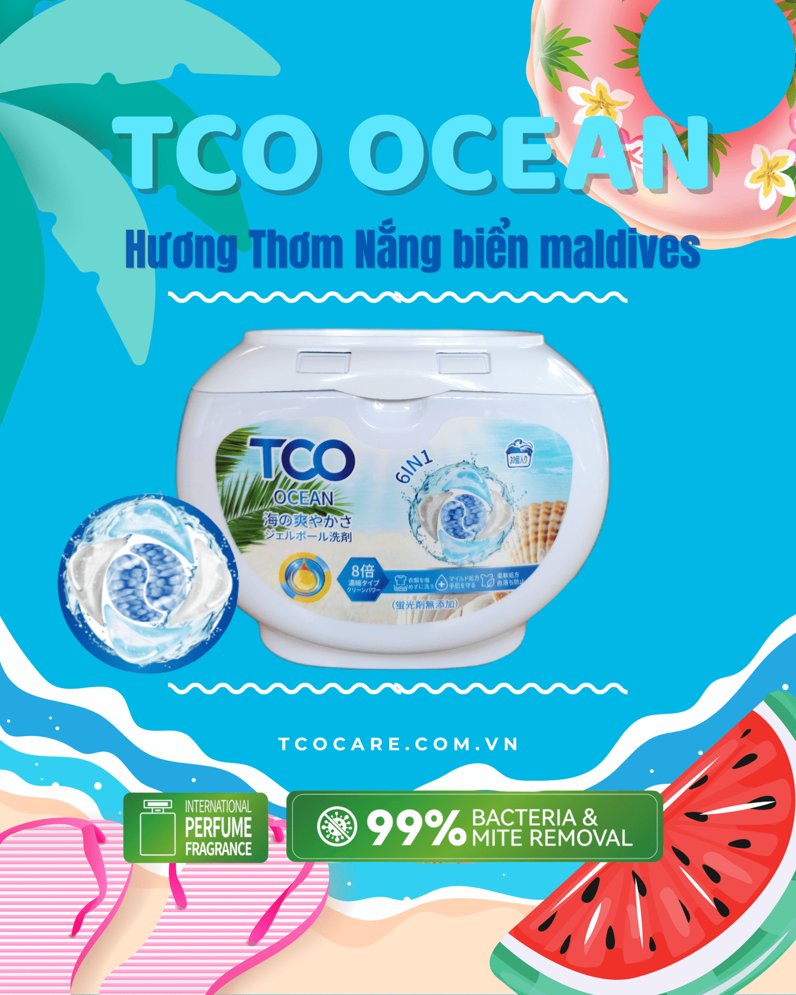 Trải nghiệm cảm giác tươi mát như đang nghỉ dưỡng giữa Maldives với TCO Ocean 6in1 – viên giặt công nghệ Nhật Bản. Sạch sâu – thơm lâu – diệt khuẩn 99%, giúp quần áo mềm mại, lưu hương chuẩn quốc tế. Sức mạnh gấp 8 lần giặt thông thường, an toàn cho da – là lựa chọn hoàn hảo cho gia đình hiện đại!
