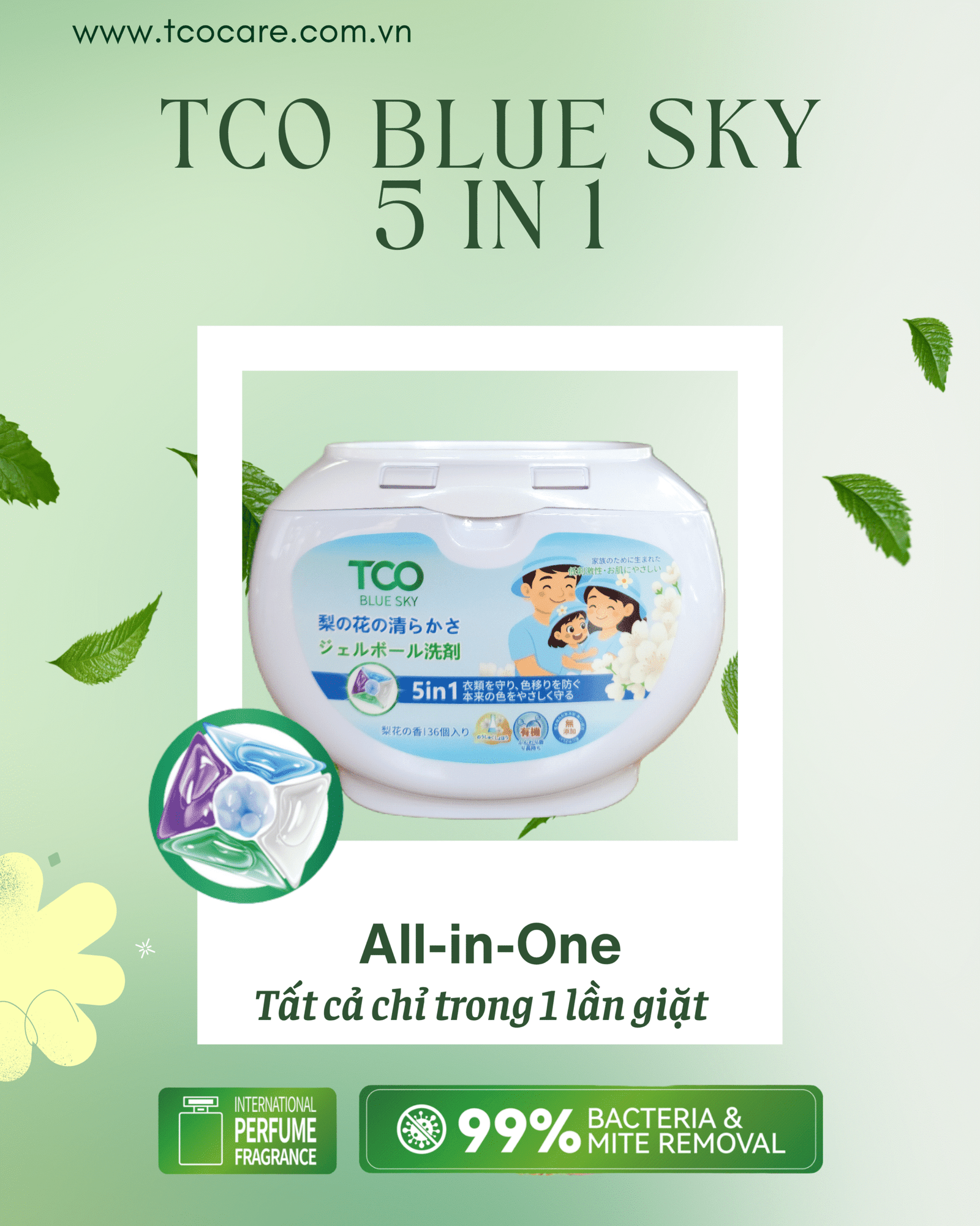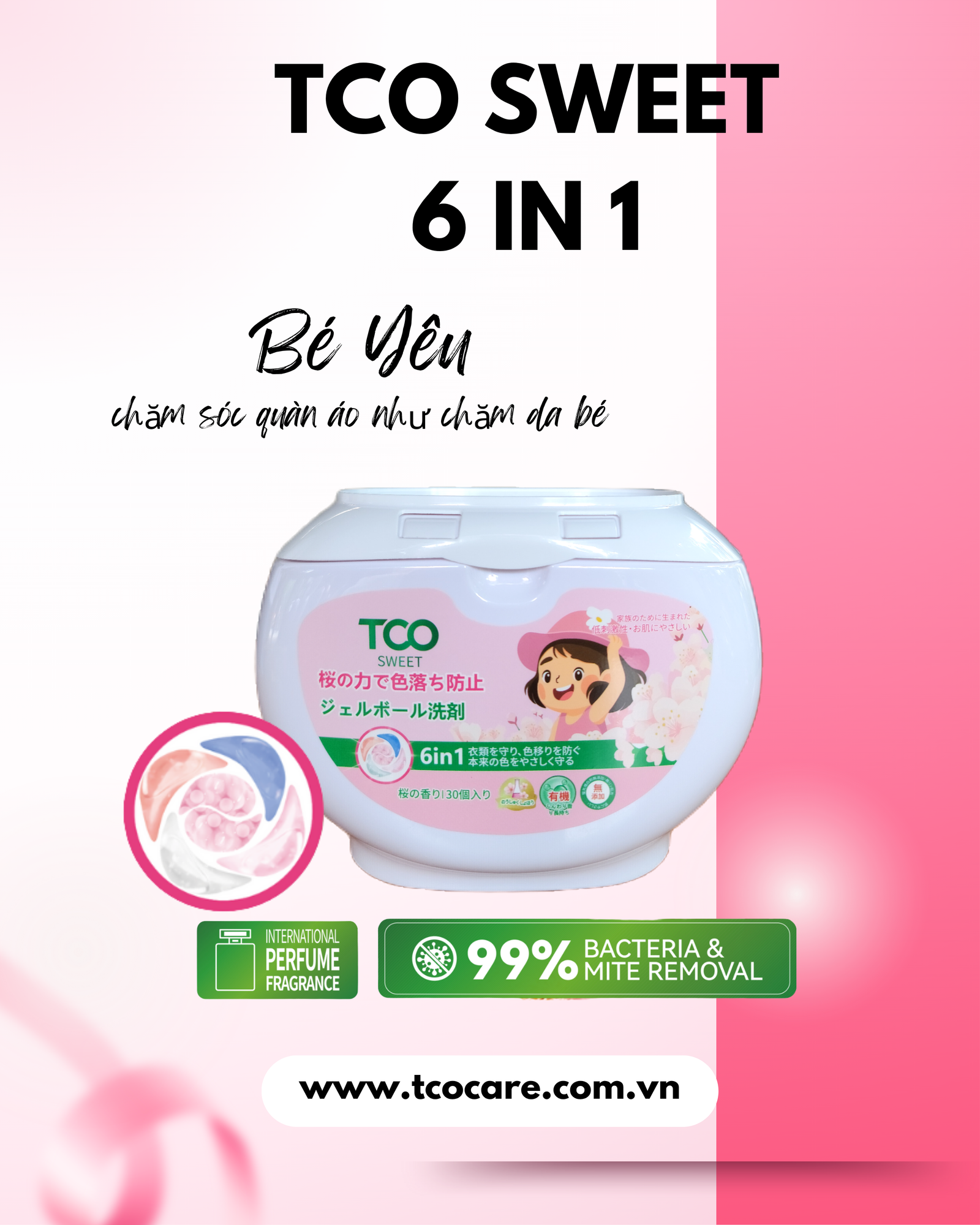 Chăm sóc quần áo bé như chăm làn da bé yêu – nhẹ nhàng, sạch khuẩn, thơm mát tự nhiên. TCO Sweet 6in1 tích hợp công nghệ giặt sạch chuyên sâu, giúp loại bỏ 99% vi khuẩn & bụi mịn nhưng vẫn dịu nhẹ với da nhạy cảm. 6 chức năng trong 1 viên: Giặt sạch – Làm mềm – Kháng khuẩn – Khử mùi – Giữ màu – Lưu hương Sakura thanh thoát.
