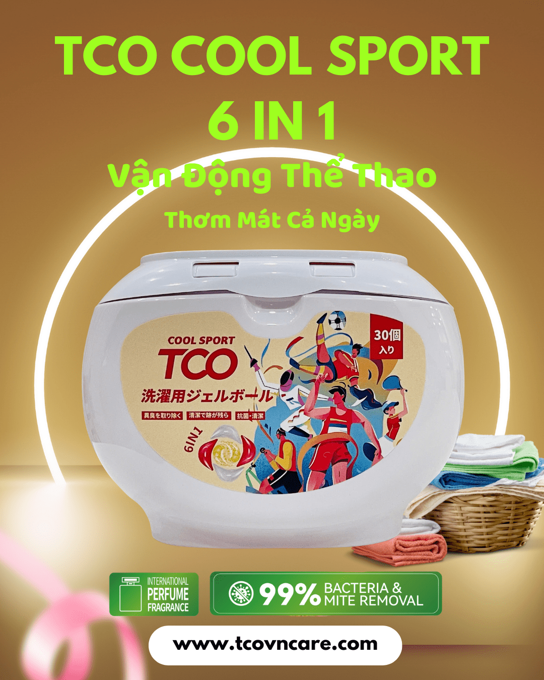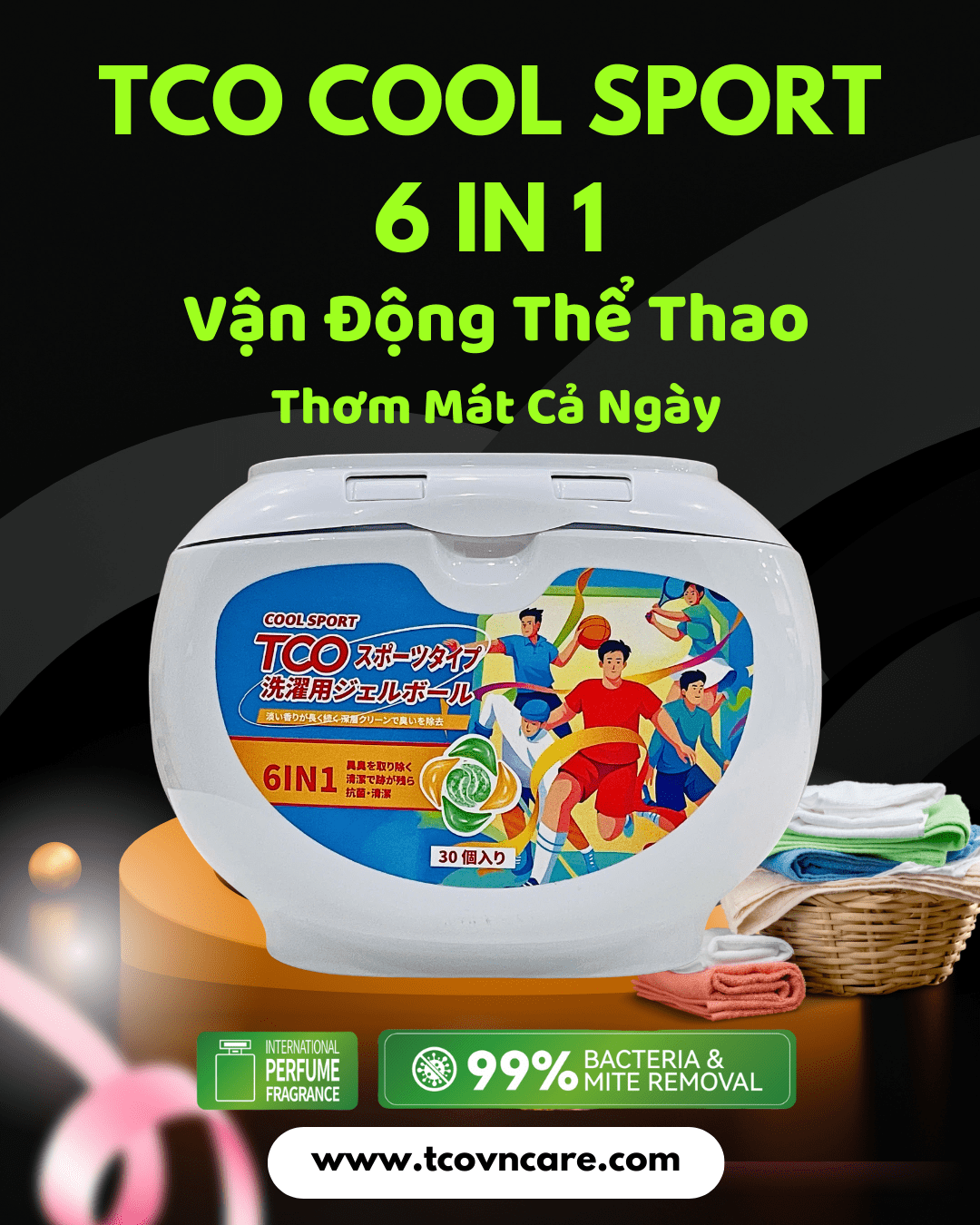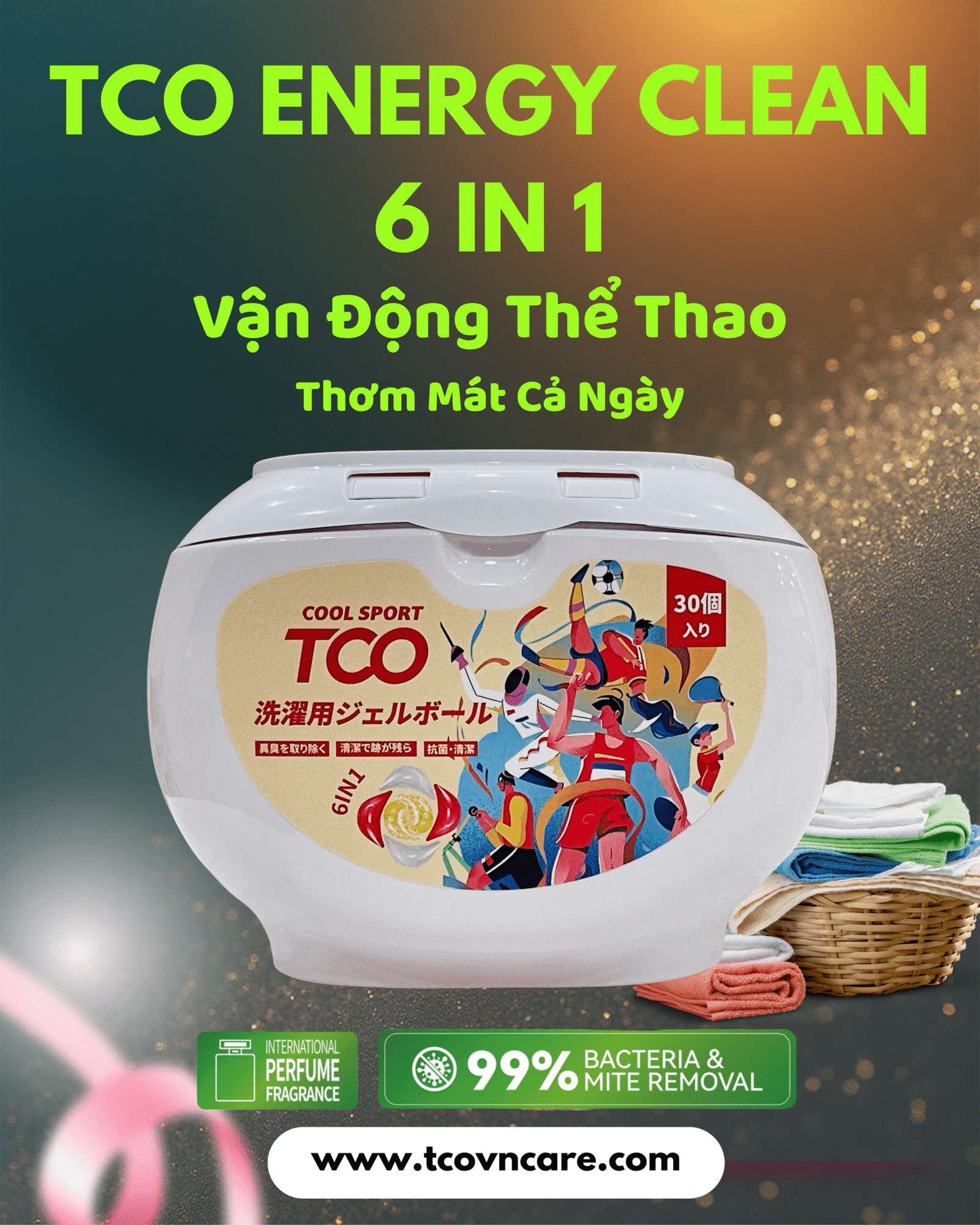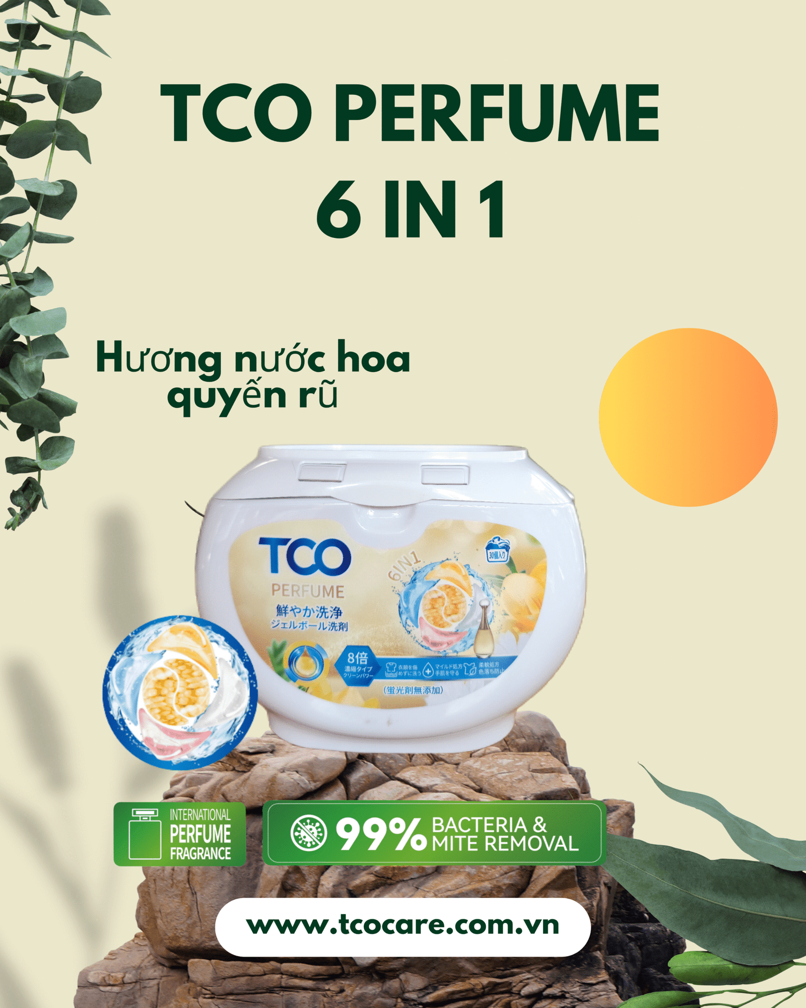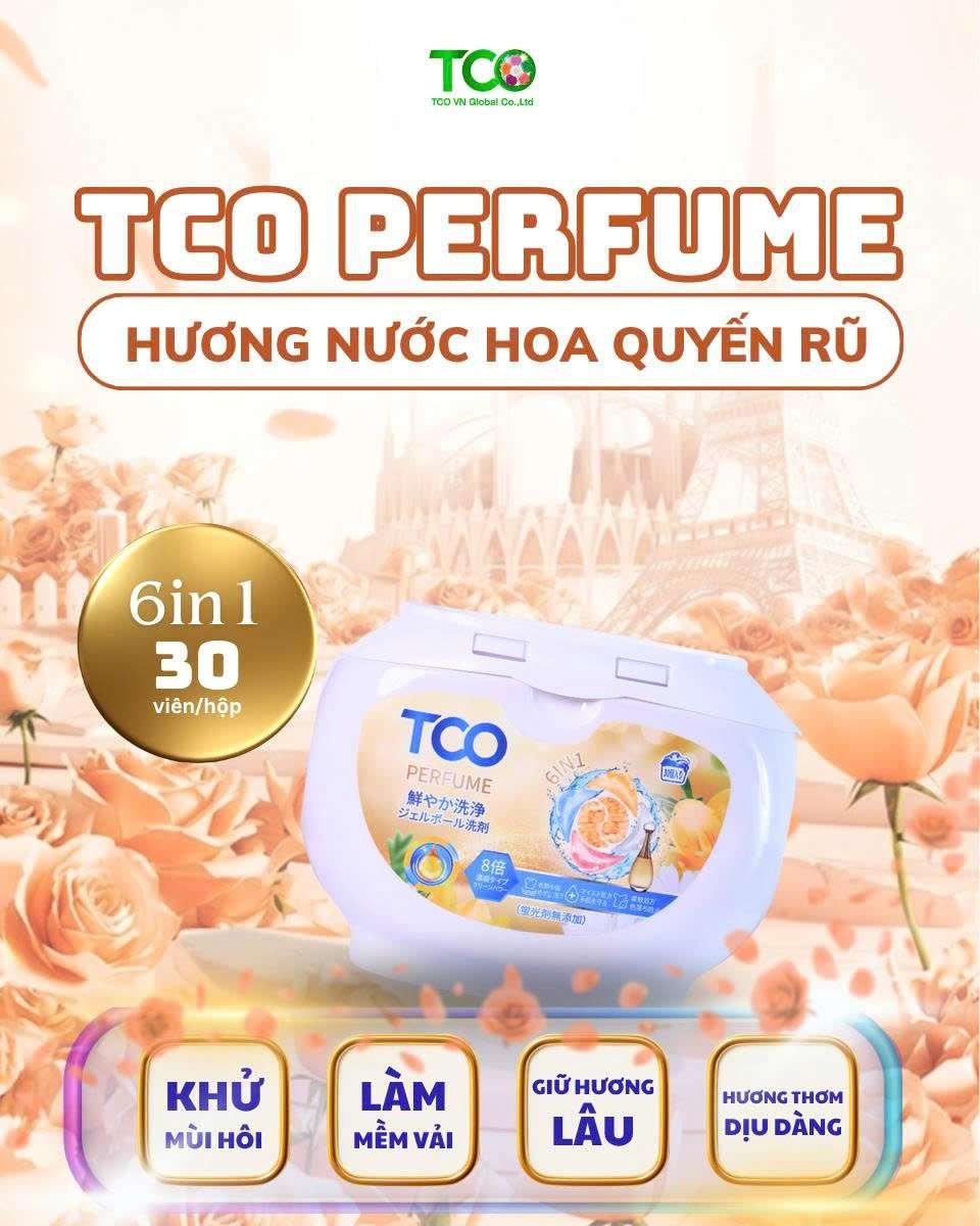 Kết hợp giữa công nghệ giặt sạch vượt trội và hương nước hoa cao cấp, TCO Perfume là lựa chọn cho những ai yêu thích mùi hương sang trọng, cuốn hút. Với 6 công dụng trong 1 viên giặt: tẩy sạch vết bẩn, kháng khuẩn, giữ màu, khử mùi, làm mềm vải và lưu hương nước hoa suốt 24h. Một lần giặt – thơm ngát cả ngày, cho bạn tự tin khoe phong cách!
