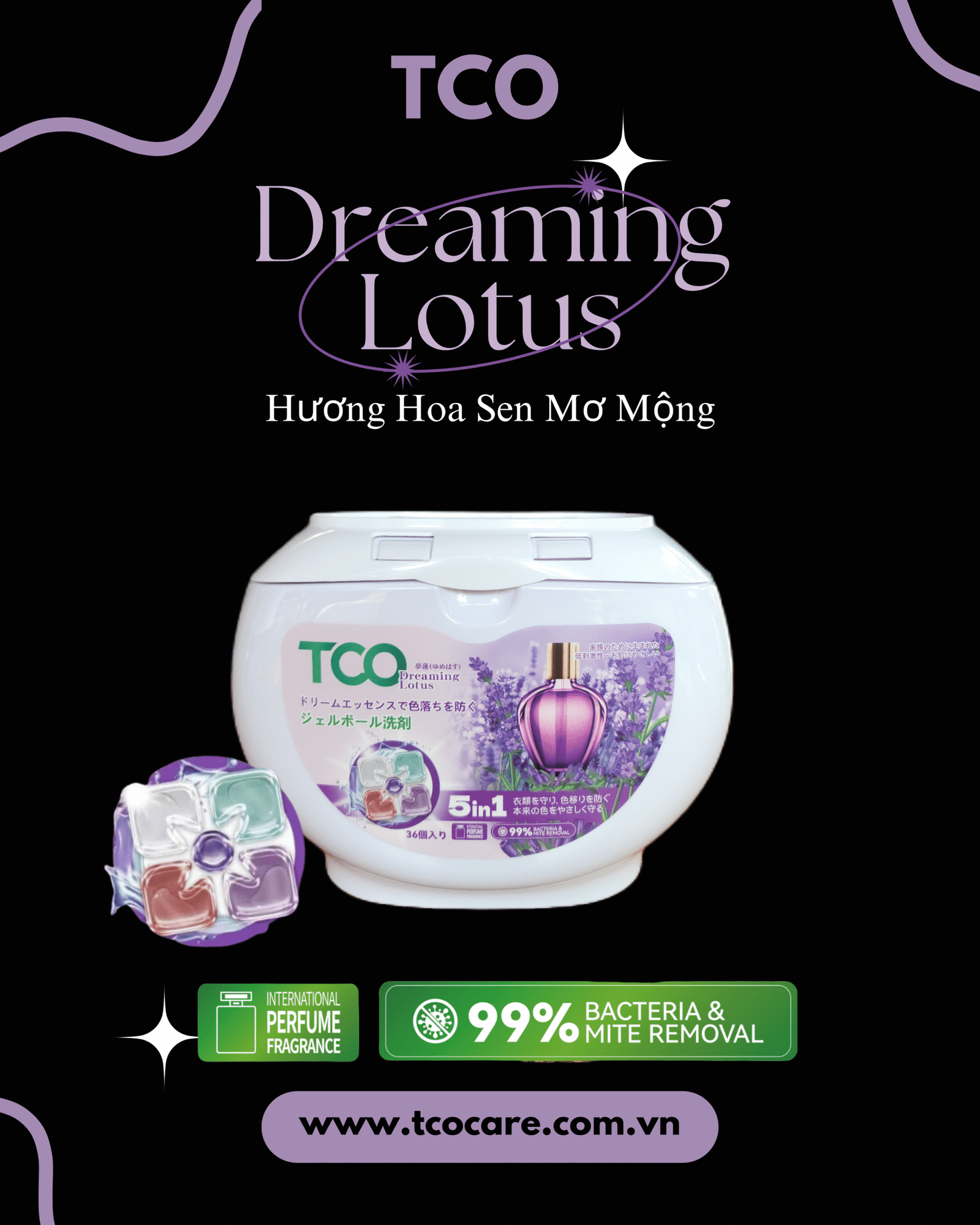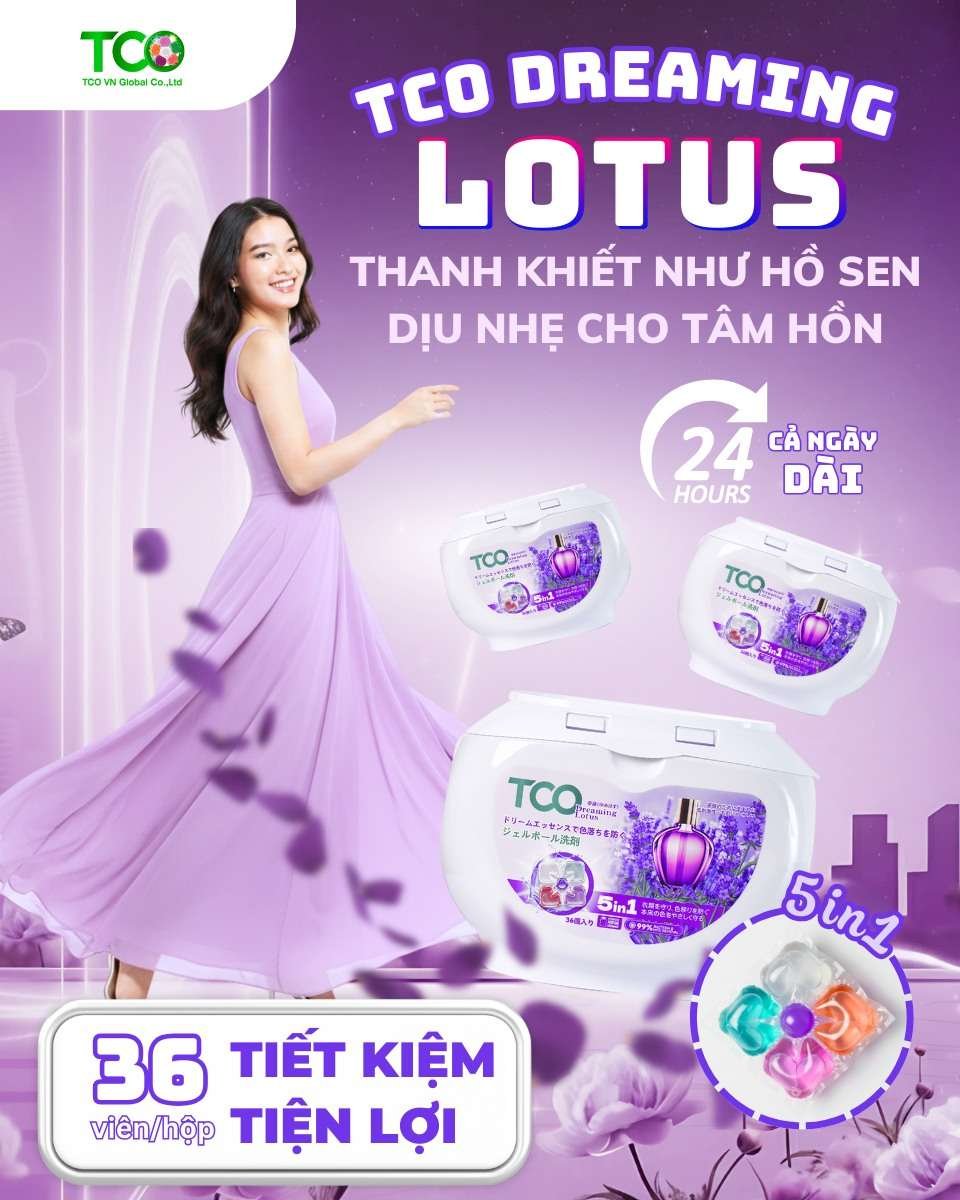 Mang hơi thở thanh khiết của đóa sen dịu dàng, TCO Dreaming Lotus không chỉ làm sạch mà còn mang đến trải nghiệm giặt giũ đầy thư thái như đang “spa” cho quần áo. 5 công dụng trong 1 viên: Giặt sạch sâu – Kháng khuẩn – Làm mềm vải – Lưu hương thơm lâu – Bảo vệ từng sợi vải. Một lần giặt – cả ngày ngát hương, chuẩn gu thanh lịch, dịu dàng!
